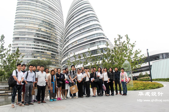 考察團隨后抵達了由著名建筑師扎哈·哈迪德(Zaha Hadid)擔(dān)綱總設(shè)計師的“首都印象建筑”——望京SOHO。考察中,學(xué)員對望京SOHO項目的設(shè)計手法及細節(jié)、如何解決多專業(yè)交叉問題、如何運用流線型設(shè)計手法、如何將景觀細節(jié)與建筑相融合等諸多設(shè)計難點進行了交流。